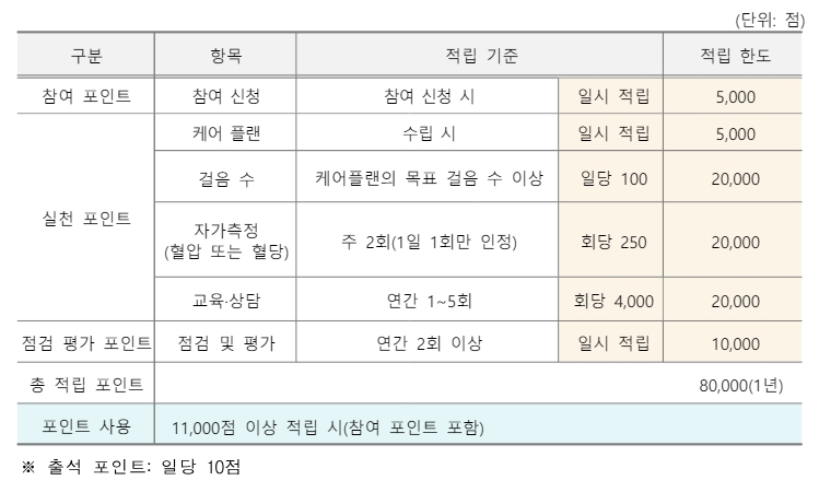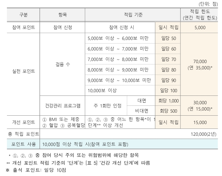 | 예방형 | 120,000 포인트 | 2년 | 프로그램이수, 걷기 등 |