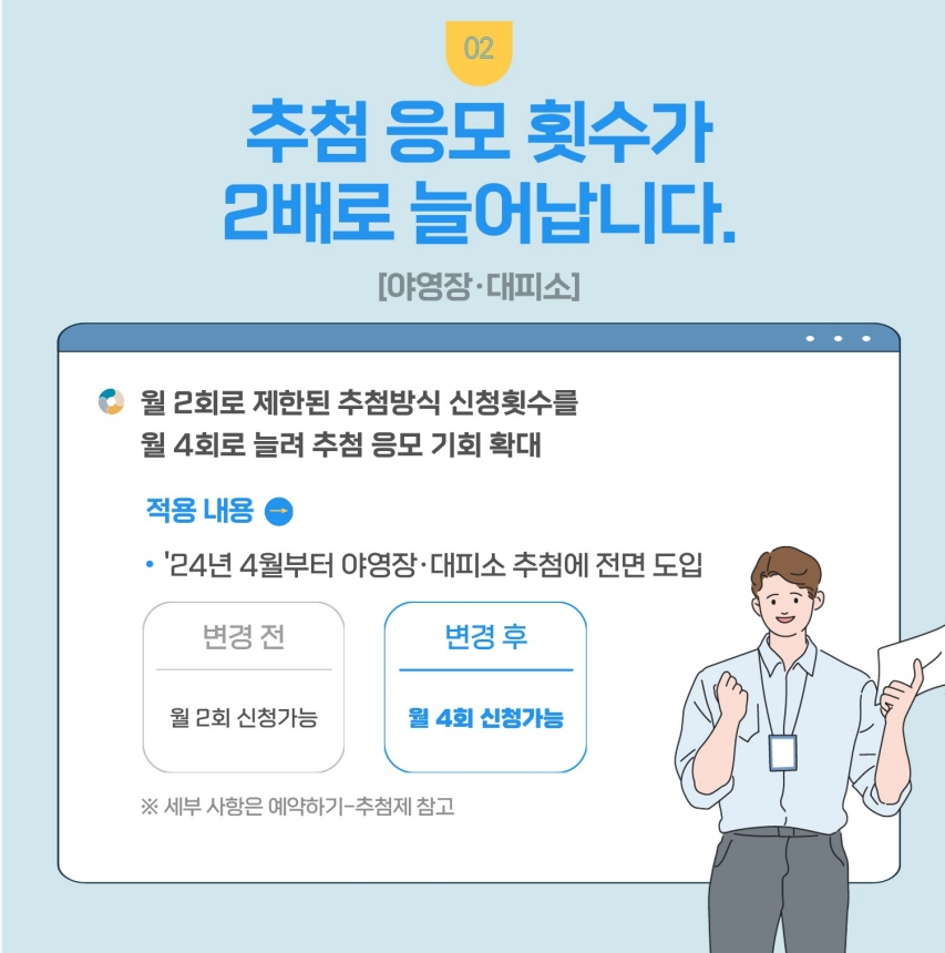 2024년 5월부터 더 공평한 기회를 제공하기 위해 전국 44개 야영장 예약이 추첨방식으로 운영됩니다.