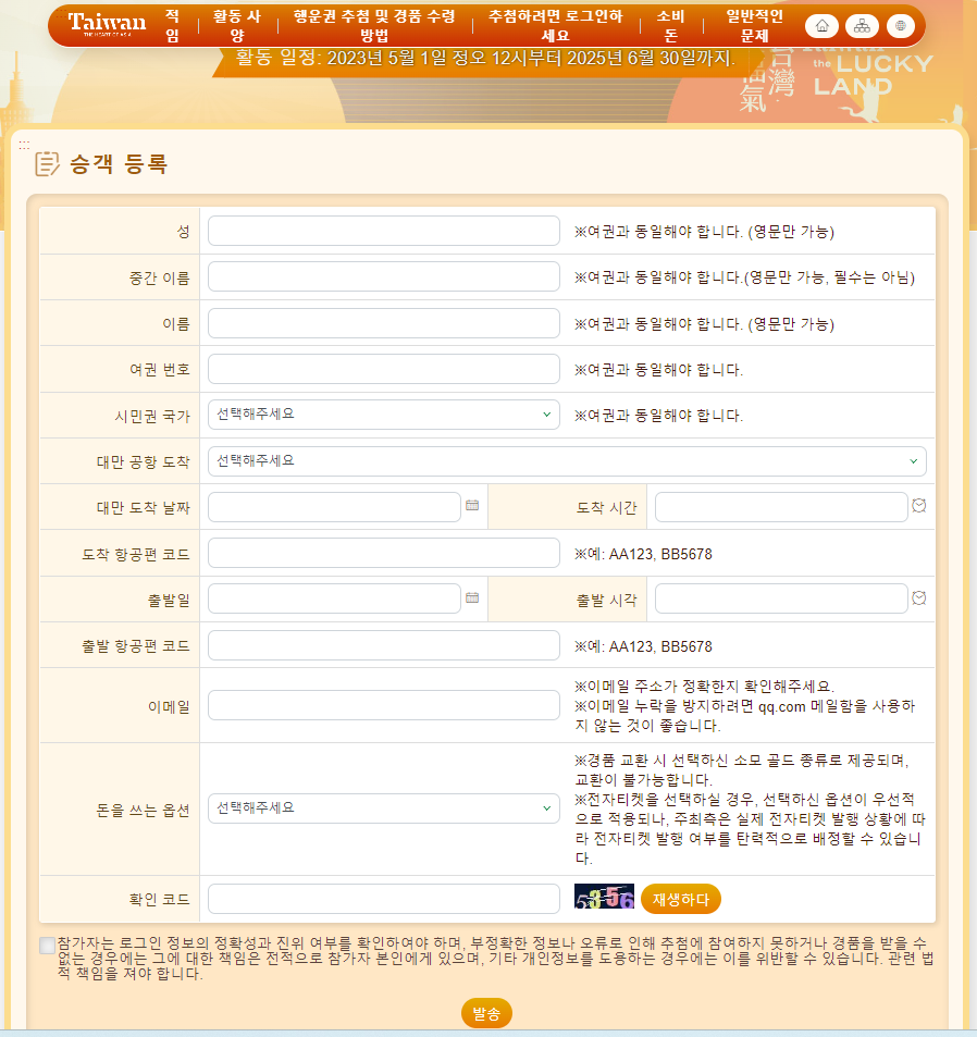 2. 주의사항 : 대만 비행기표를 예매했다고 해서 바로 신청 할 수 있는 것은 아니며, 대만 도착예정 7일 전부터 1일 전까지만 신청이 가능합니다. 출국 전 한국에서 미리 신청하시고 공항에서 당첨유무를 확인하시면 됩니다.