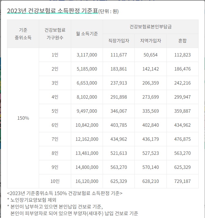 • 소득요건 : 중위소득 150% 이하(건강보험료 기준)